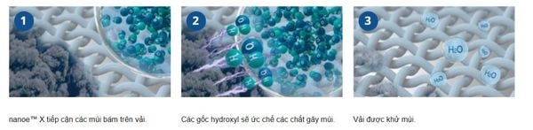 Các phân tử nanoe™ X có kích thước nhỏ hơn cả các hạt hơi nước, xâm nhập sâu vào vải, giúp khử mùi hiệu quả cao.1-5 Các gốc hydroxyl tiếp cận nguồn gốc gây ra mùi và ức chế chúng. Loại bỏ hoàn toàn các mùi thường gặp.