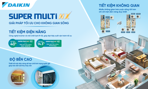 Với 1 dàn nóng kết nối tối đa 5 dàn lạnh (loại treo tường và giấu trần nối ống gió), Super Multi NX phục vụ cho căn hộ và biệt thự với không gian lớn và sang trọng, không chỉ tiết kiệm không gian và điện năng mà cho sự lựa chọn dàn lạnh đa dạng, đảm bảo hài hòa với nội thất.