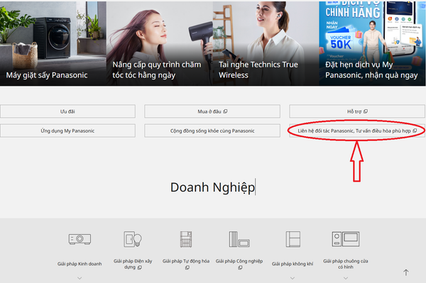 Bước 2 : Kéo xuống trước nội dung Doanh nghiệp và Click vào Liên hệ đối tác Panasonic, Tư vấn điều hòa phù hợp
