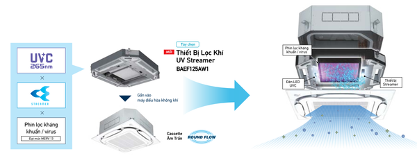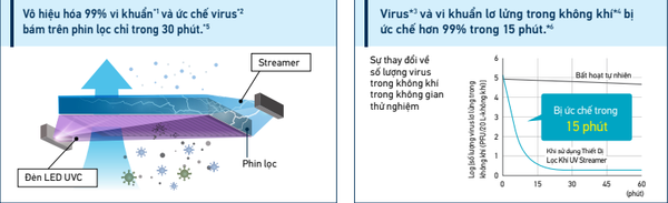 Đèn LED UV sâu phát ra tia ánh sáng vô hình có bước sóng từ 10 đến 400 nanomet và bước sóng ngắn từ 100 đến 280 nm được gọi là tia UV sâu – UVC. Daikin đã sử dụng đèn led tia UV sâu cho bộ lọc khí, chiếu tia UV có bước sóng 265mm có tác dụng khử trùng cao. Kết hợp với Streamer vô hiệu các chất độc hại, và phin lọc kháng khuẩn đạt chuẩn MERV 13 ức chế 99% vi khuẩn, virus trong vòng 15 phút.