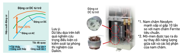 Các model Inverter của Daikin được trang bị máy nén xoắn ốc DC từ trở. Máy nén xoắn ốc DC từ trở sử dụng 2 loại mô-men khác nhau, nam châm neodym và mô-men từ trở. Động cơ này có thể tiết kiệm năng lượng vì nó tạo ra nhiều năng lượng hơn với công suất điện nhỏ hơn so với động cơ AC hoặc DC trước đó.